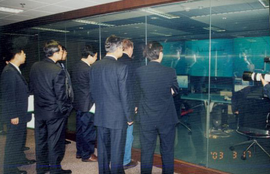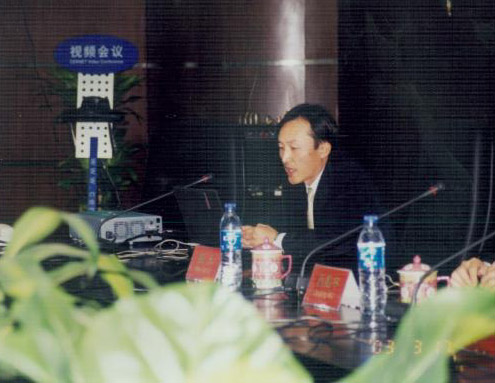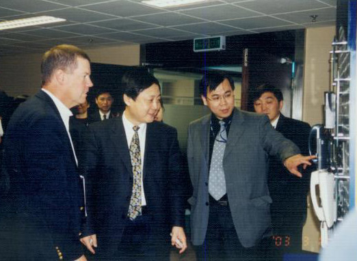 座谈竣事后,,,,,,麦克尼利先生一行在CERNET国家网络中心主任吴建平的陪同下,,,,,,绕有兴趣的旅行了公司的营业及网络监控展示厅。。。。。。