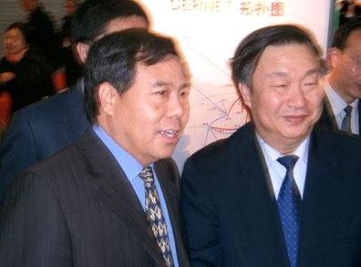 (图为信产部部长王旭东在教育部科技生长中心主任李志民陪同下旅行CERNET展示区)