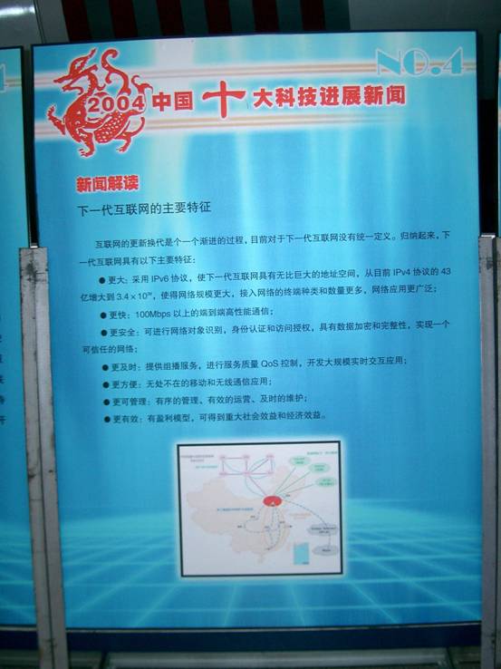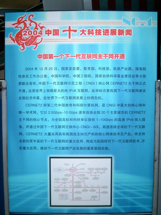 日前,, ,,,“2004年中国、天下十大科技希望新闻”科普展览在北京中国科技馆开幕。 。。。。 。展览由科学报时社、中国科学院院士事情局、中国工程院学部事情局和中国科学手艺馆团结举行,, ,,,将在天下各地科技馆巡回展出。 。。。。 。此次展览的主要内容是“振邦杯2004年中国十大科技希望新闻和天下十大科技希望新闻”,, ,,,由584名中国科学院院士和中国工程院院士投票选出。 。。。。 。作为2004年科技生长重大事务之一,, ,,,以中国下一代互联网树模工程CNGI焦点网CERNET2也加入了此次天下巡展,, ,,,并将以图文并茂、专家点评、新闻链接等形式,, ,,,全方位、立体化展现给社会公众。 。。。。 。