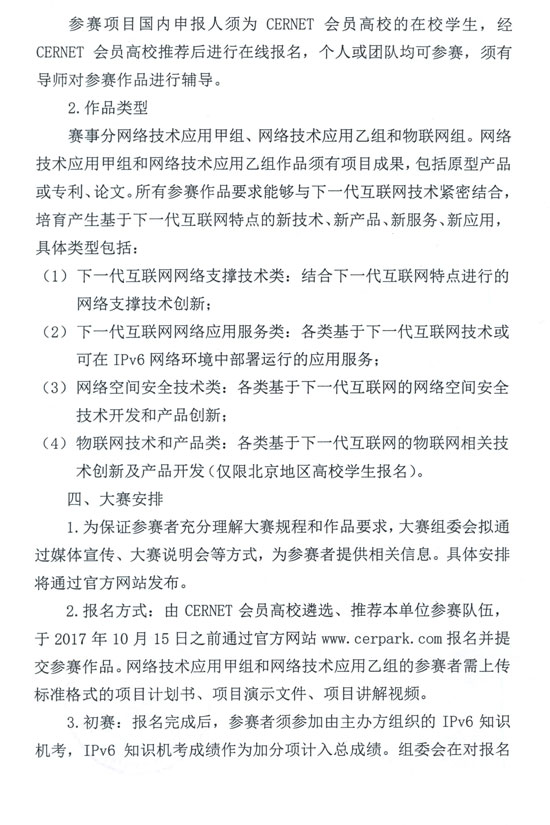 ¡¡¡¡ 2.±¨Ãû·½·¨£ºÓÉCERNET»áÔ±¸ßУåàÑ¡¡¢ÍƼö±¾µ¥Î»²ÎÈü²½¶Ó£¬£¬£¬£¬£¬£¬£¬£¬ÓÚ2017Äê10ÔÂ15ÈÕ֮ǰͨ¹ý¹Ù·½ÍøÕ¾www.cerpark.com±¨Ãû²¢Ìá½»²ÎÈü×÷Æ·¡£¡£¡£¡£¡£¡£¡£¡£ÍøÂçÊÖÒÕÓ¦Óü××éºÍÍøÂçÊÖÒÕÓ¦ÓÃÒÒ×éµÄ²ÎÈüÕßÐèÉÏ´«±ê×¼ÃûÌõÄÏîÄ¿ÍýÏëÊé¡¢ÏîÄ¿ÑÝʾÎļþ¡¢ÏîÄ¿½â˵ÊÓÆµ¡£¡£¡£¡£¡£¡£¡£¡£