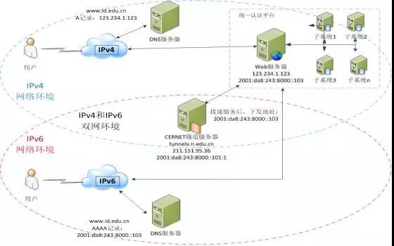 关于中型统一认证类网站安排于IPv4情形下:在网络层,,,,,,,域名有AAAA剖析纪录,,,,,,,指向web效劳器的IPv6地点;;;;;;;;在中心层,,,,,,,使用CERNET隧道效劳,,,,,,,拨通效劳并获得下发的IPv6地点,,,,,,,修改tomcat的设置,,,,,,,使得tomcat效劳可启动在IPv6的80端口上。。。。。。为使处于IPv6情形下的用户能够正常会见该网站,,,,,,,使用隧道效劳对该网站举行升级刷新。。。。。。详细计划流程如下:
