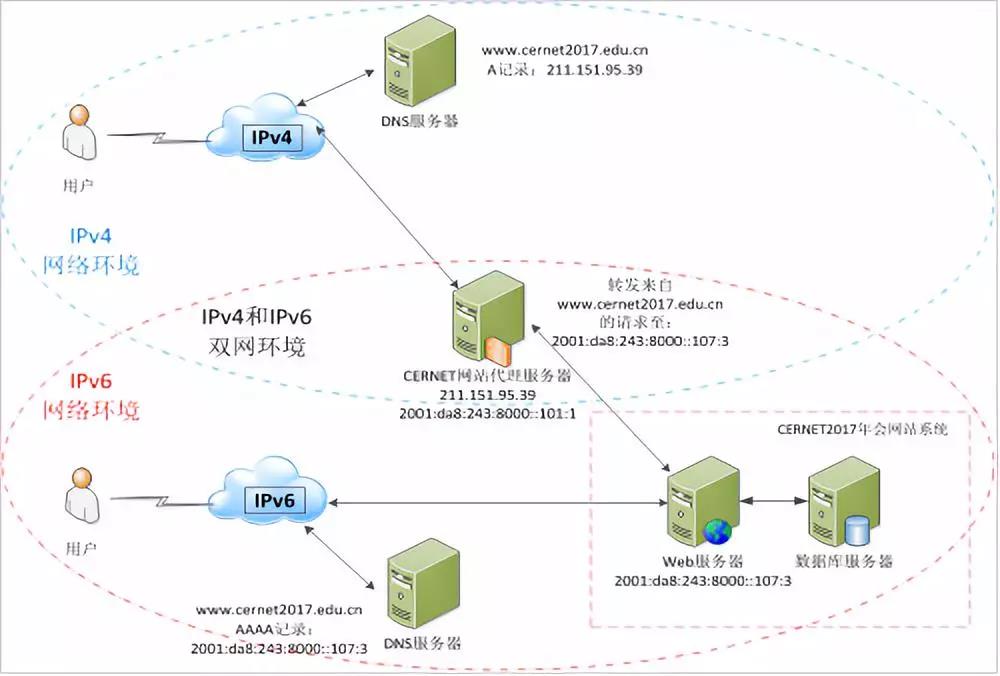为使处于IPv4情形下的用户也可以正常会见CERNET年会网站,,,,,,,使用反向署理效劳对该网站举行升级刷新。。。。。。在网络层,,,,,,,域名www.cernet2017.edu.cn有A剖析纪录,,,,,,,指向CERNET网站署理效劳器;;;;;;;;在效劳器层,,,,,,,使用CERNET署理效劳器,,,,,,,CERNET网站署理效劳器将IPv4情形下的网站会见请求转发至web效劳器。。。。。。