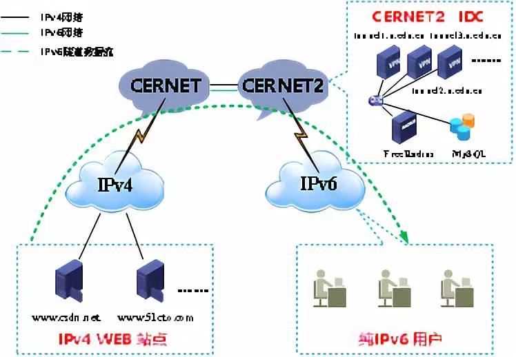 关于中小视频网站安排于IPv6情形下:机房接入CERNET2,,,,,,,web效劳器有IPv6地点;;;;;;;;域名有AAAA剖析纪录,,,,,,,指向web效劳器;;;;;;;;处于IPv6情形下的用户可正常会见。。。。。。为使处于IPv4情形下用户正常会见该网站,,,,,,,可安排IVI装备,,,,,,,使下联用户获取到IPv6地点,,,,,,,并通过IPv4带宽会见IPv6资源。。。。。。
