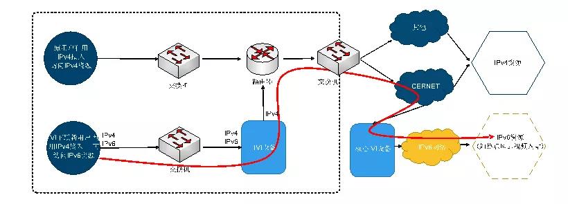 双重翻译的两级翻译器既可以脱离安排,,,,,,,也可以整合安排。。。。。。若是接纳CERNET焦点翻译器,,,,,,,二级翻译装备的上联接口为IPv6,,,,,,,毗连到纯IPv6接入网络的校园网入口路由器。。。。。。二级翻译装备的下联接口为IPv4/IPv6双栈。。。。。。